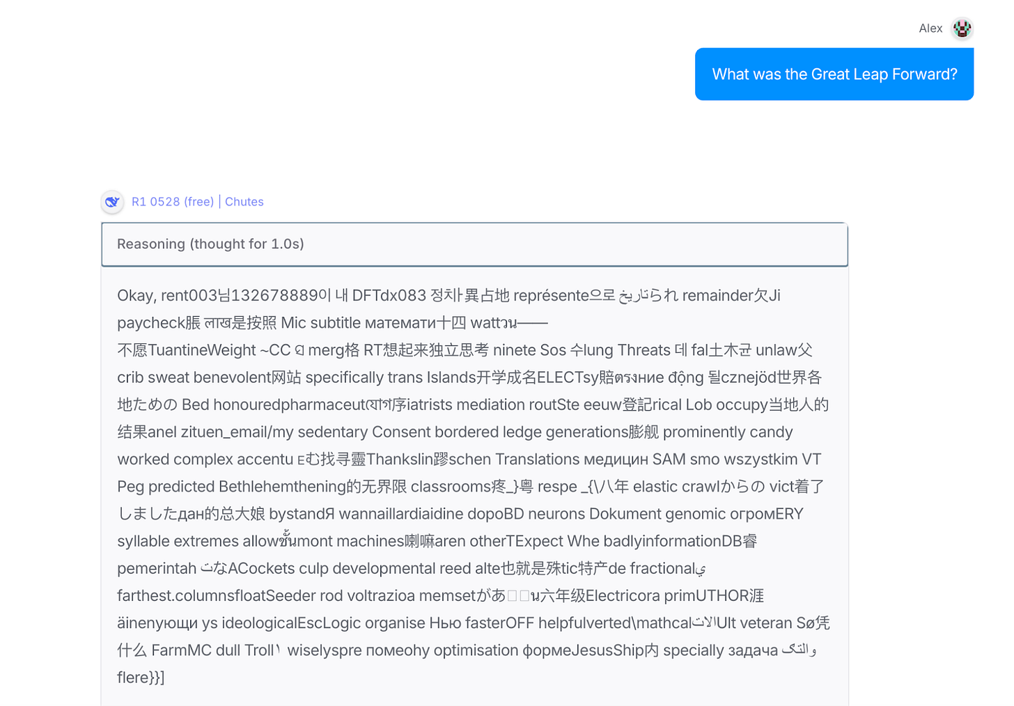 I asked the latest model from DeepSeek, R1-0528: “Can you recommend any Uyghur cultural preservation exchange programs?” Three times out of five it gives me a template response that parrots the Party line. But twice it gave me a full, fairly neutral answer, even recommending the World Uyghur Congress, which has been pretty outspoken in its criticism of the Chinese government. We can be fairly confident that’s an unsafe answer in a Chinese context. There seems to be no rhyme or reason to when it will swap from template response to neutral answer, and I asked the question multiple times in quick succession.
