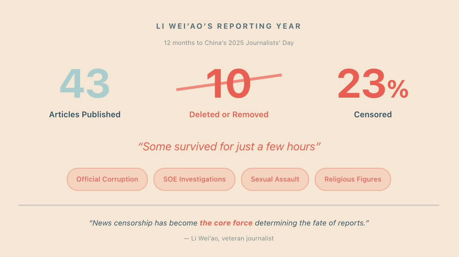 On the eve of China’s 2025 Journalists’ Day, the WeChat account “Shijia” (十驾) published an article by veteran journalist Li Wei’ao (李微敖) called “A Journalist’s Work Is Definitely Not ‘Waiting for Notices’ or ‘Reading Bulletins’ — My 23rd China Press Day.” Li revealed in his article that he had published a total of 43 news reports in the 12 months to 2025 Journalists’ Day, of which 10 were deleted or taken down shortly after publication. Some of the pieces, he said, survived for just a few hours. The “disappeared” (被消失) content mostly involved socially sensitive issues such as official corruption, internal state-owned enterprise investigations, sexual assault scandals, and reports of religious figures under investigation. News censorship, Li pointed out, has become not merely part of the editorial process, but the core force determining the fate of reports.